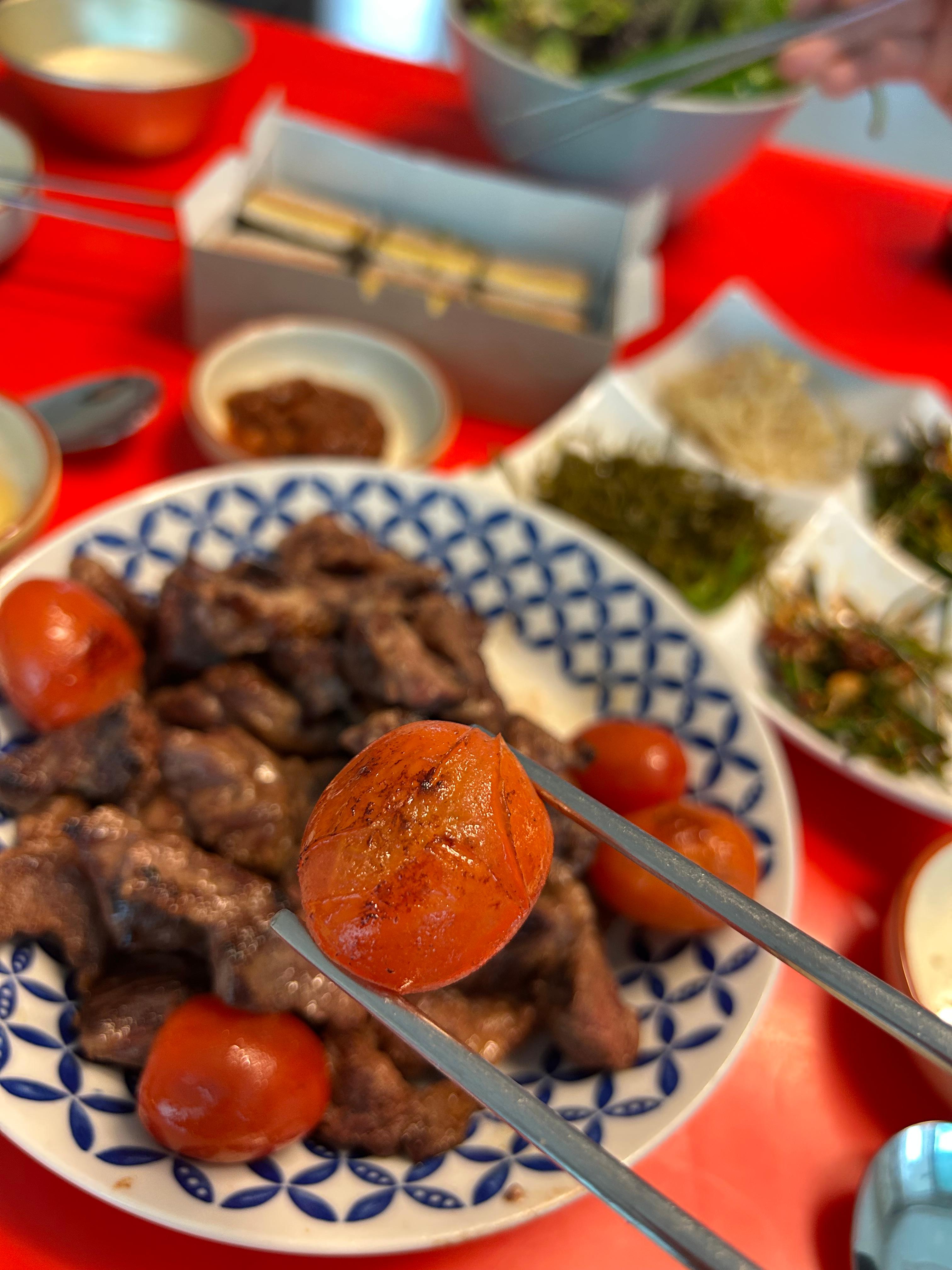 " 오늘 마 고기로 끝까지 갈라꼬. "