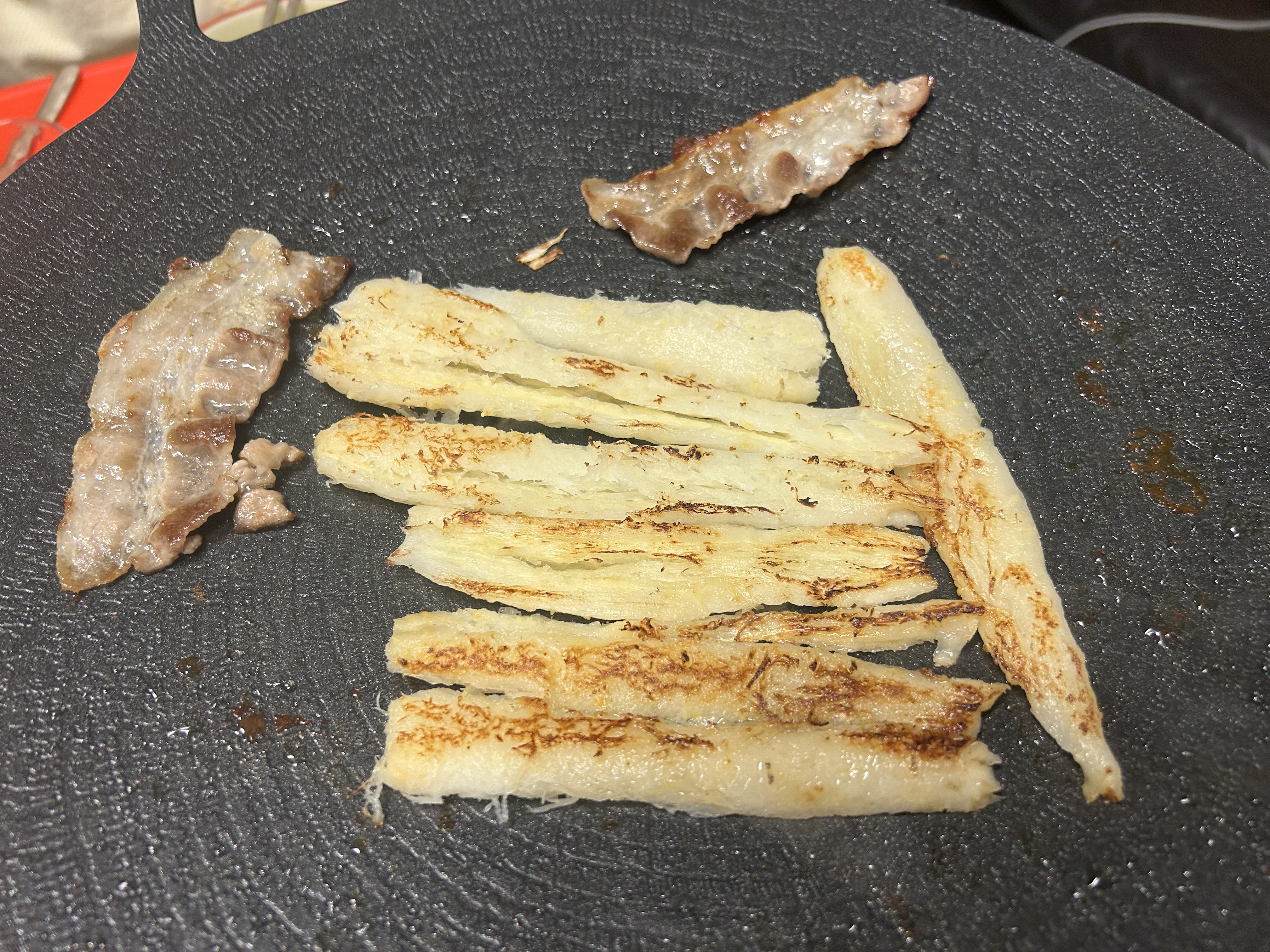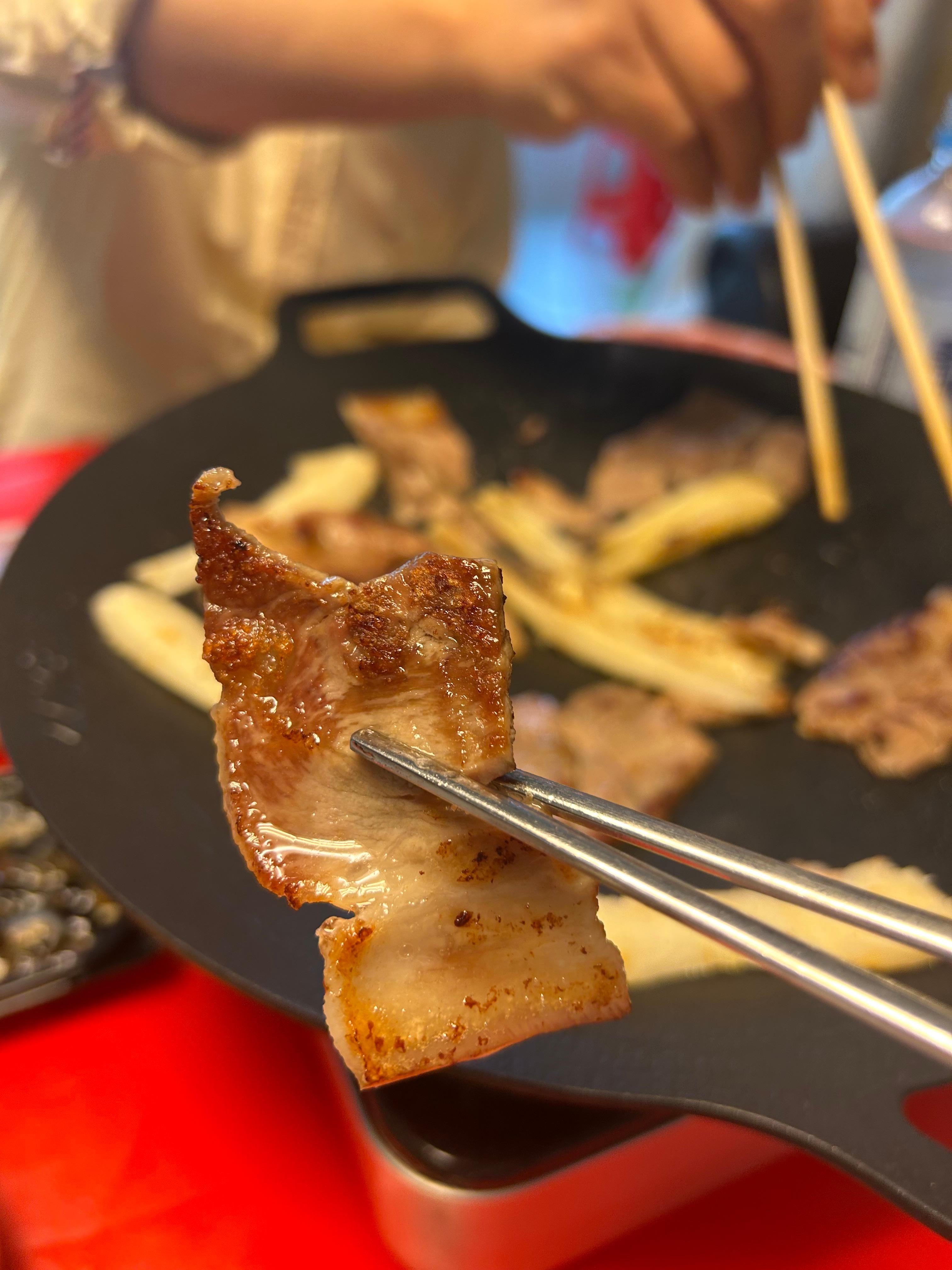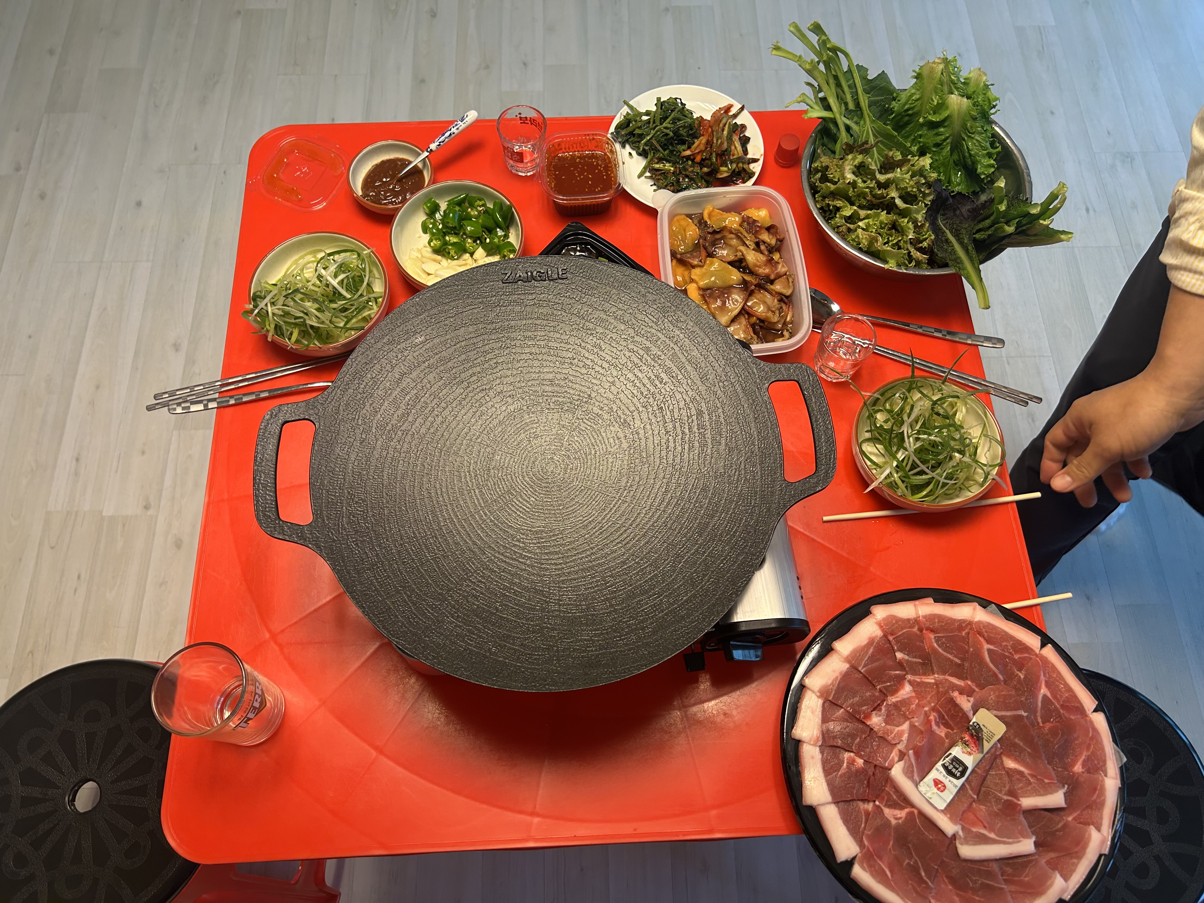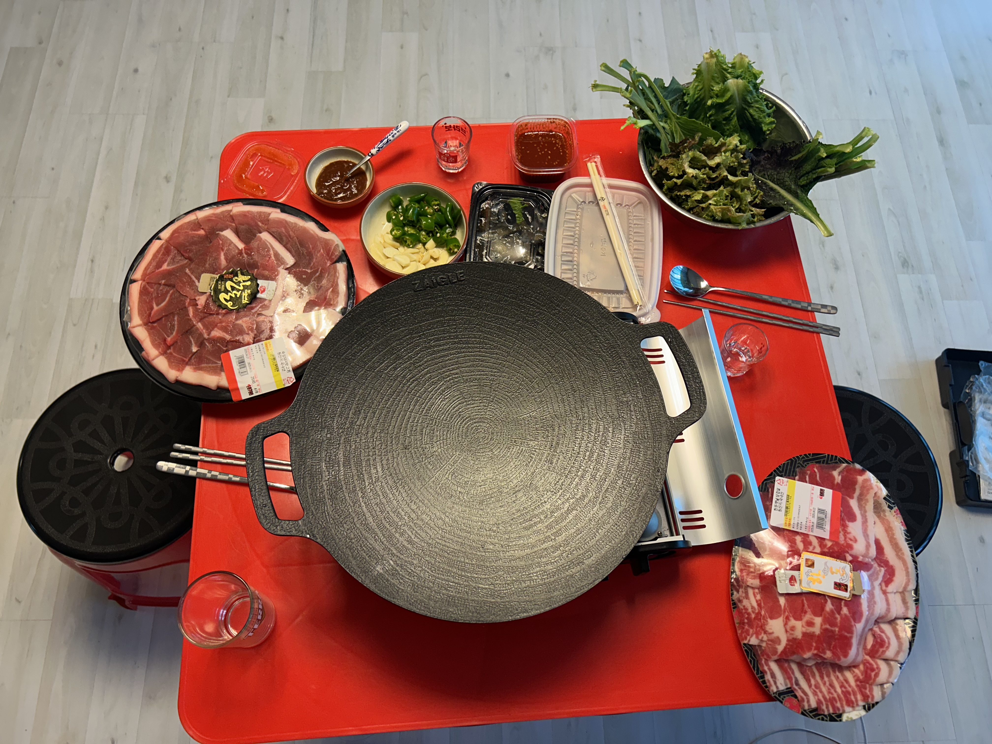 철민이랑 고기 맛나게 구워 먹고 있다.