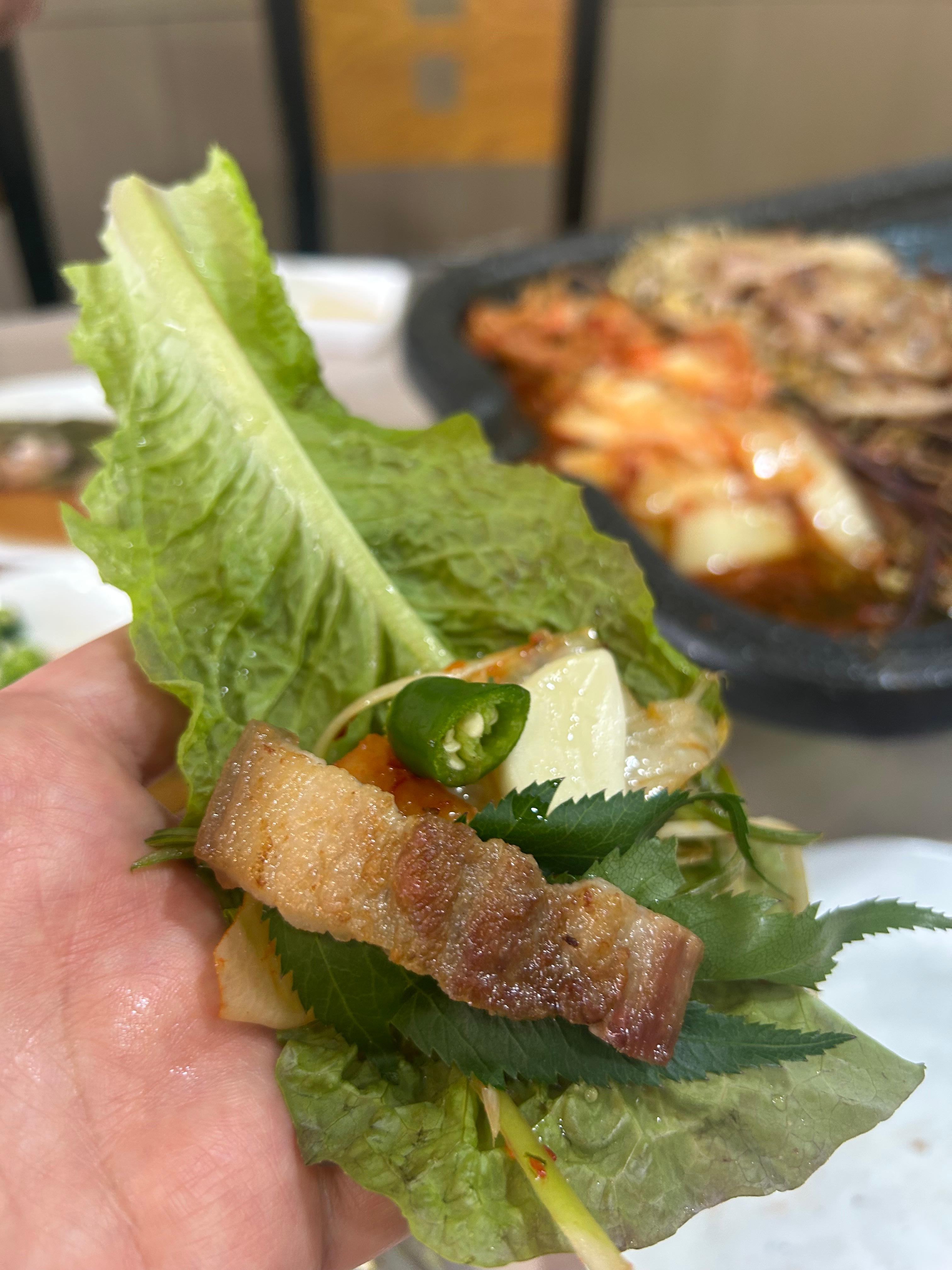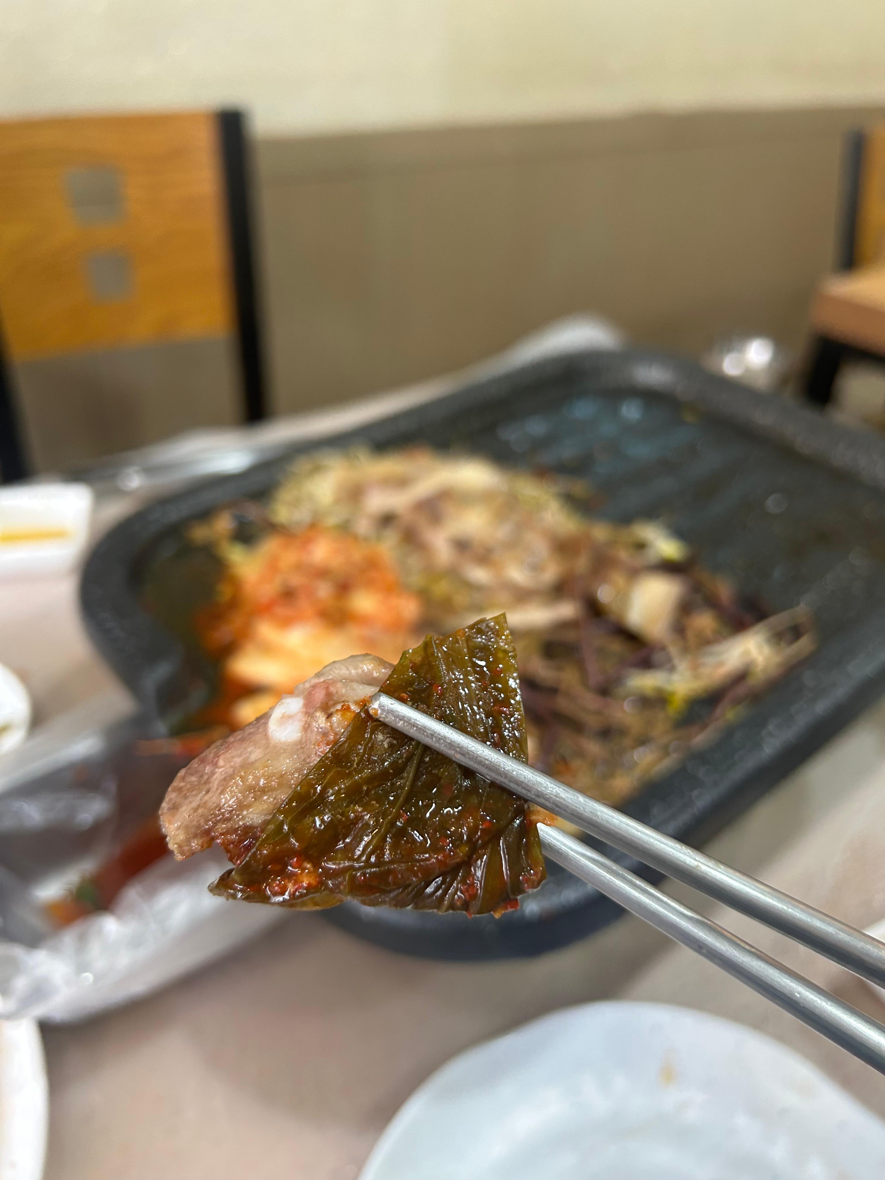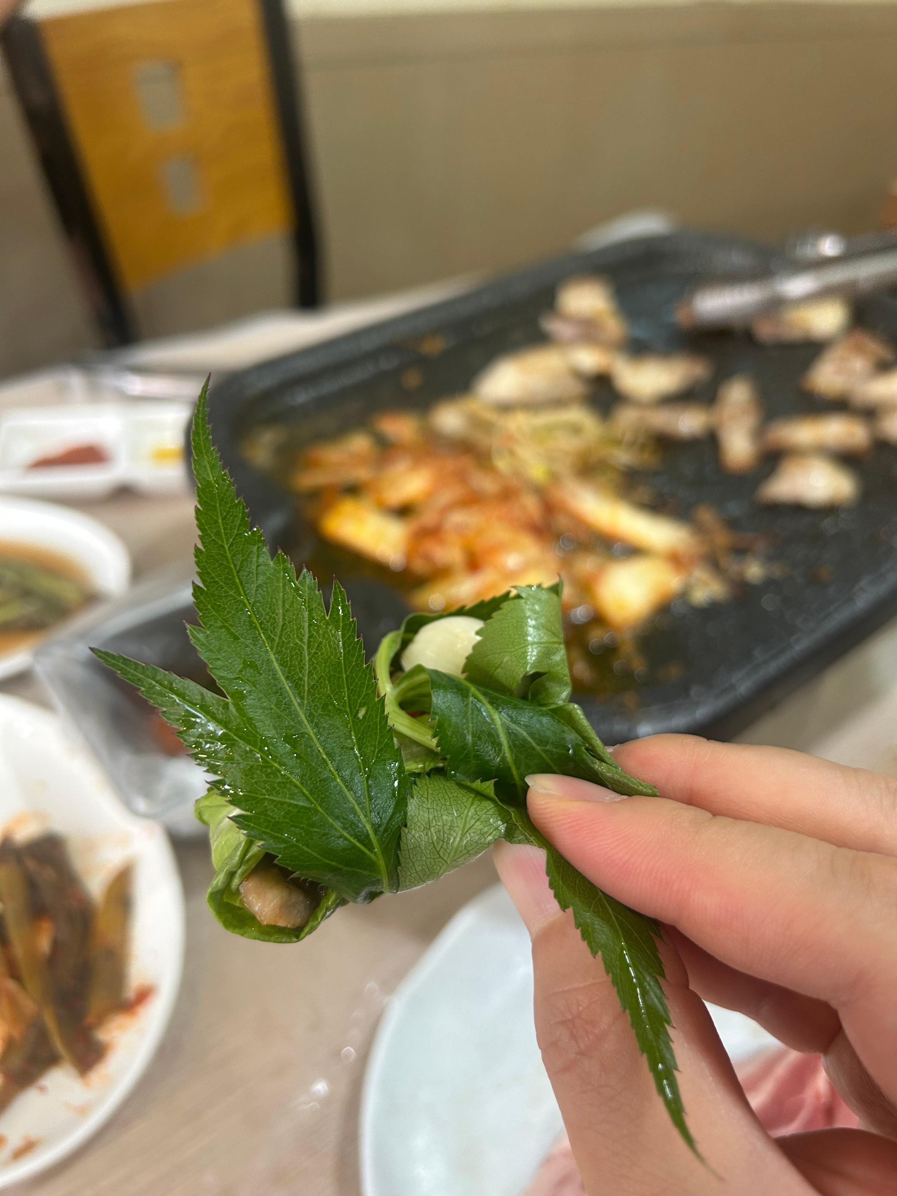 " 쌈에 구운 김치 넣어서 먹어봐봐.
