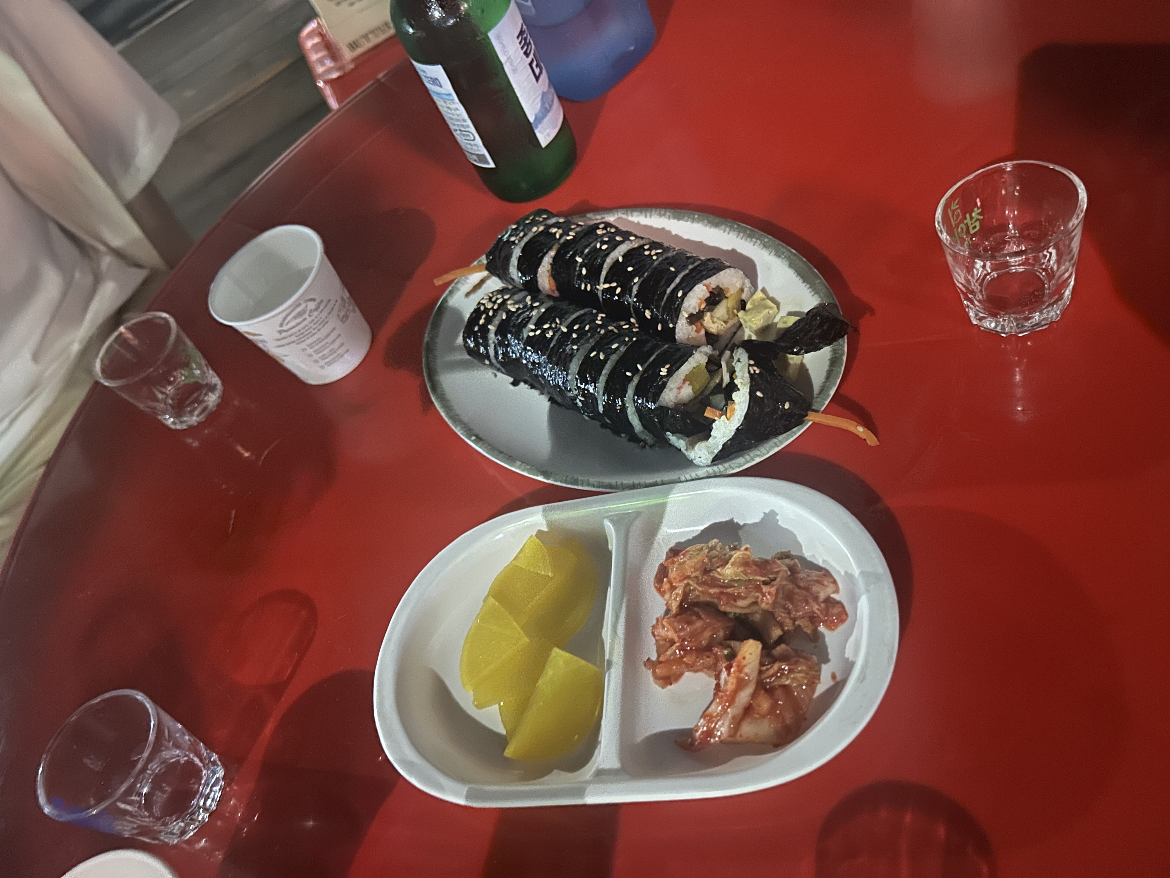 노상 테이블에서 라면에 김밥으로