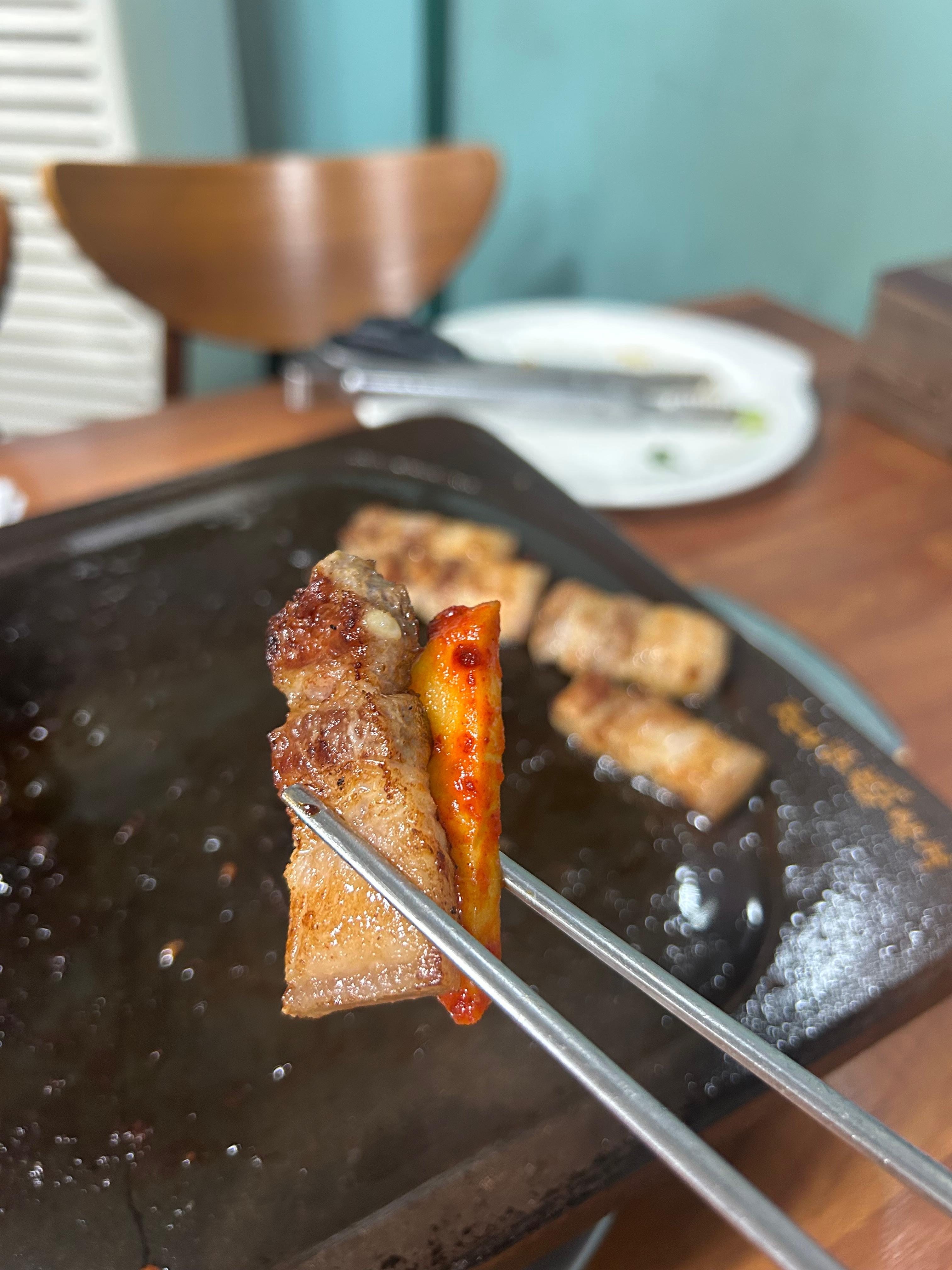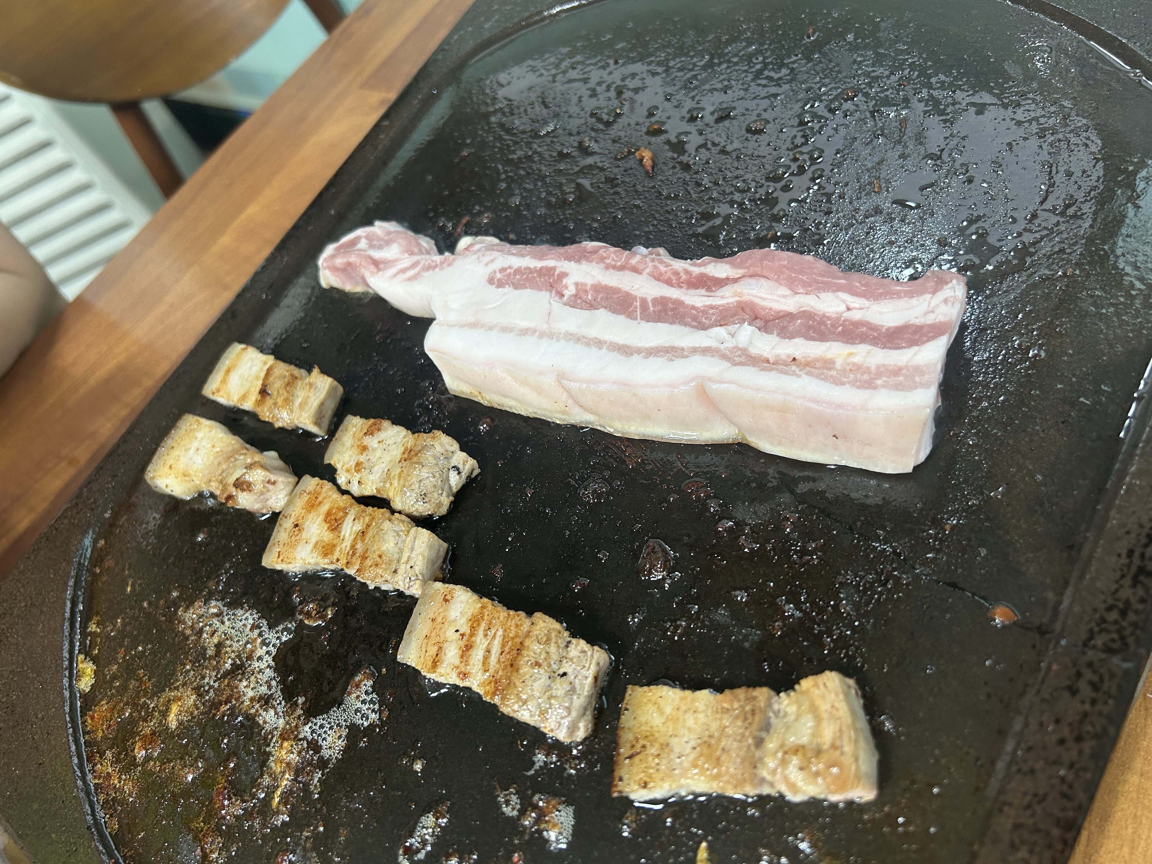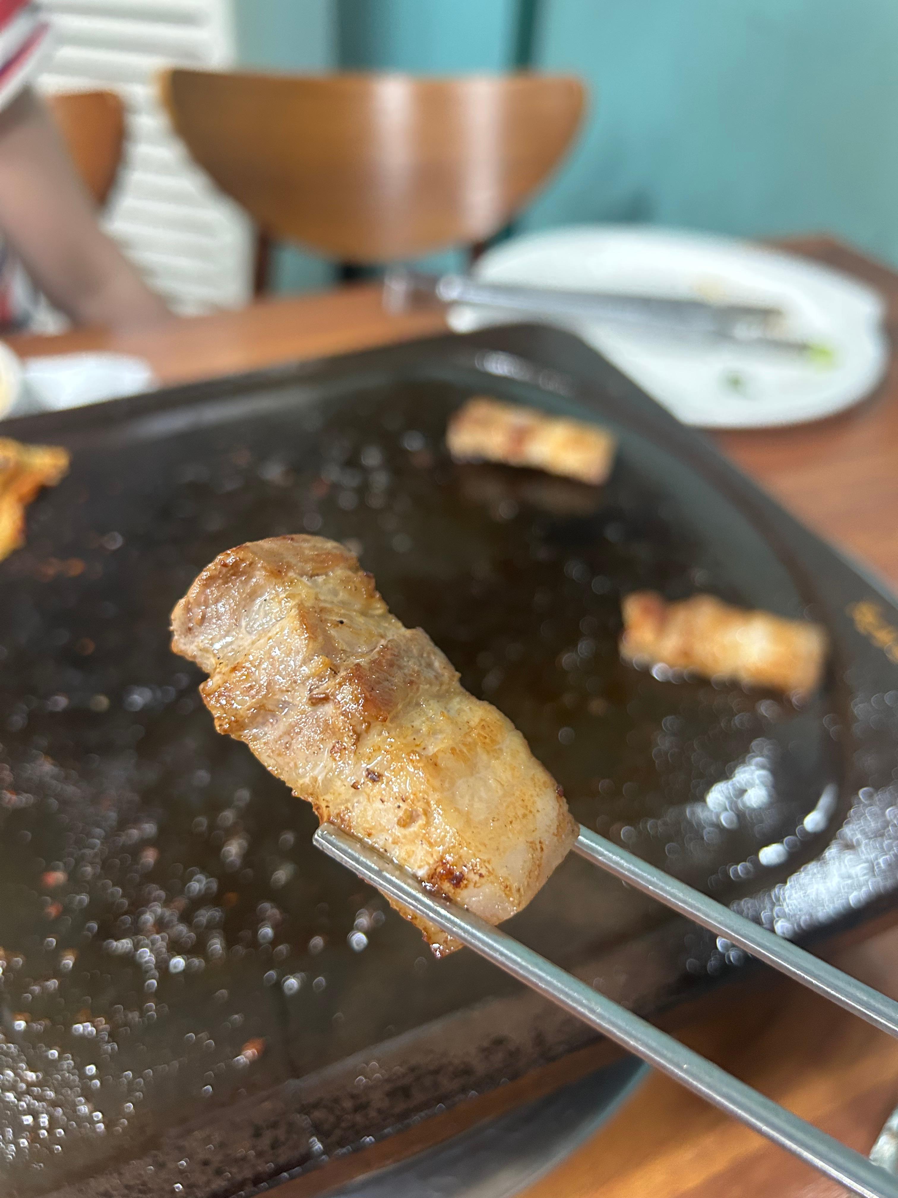잘~ 구워진 삼겹살 하나 맛을 보니?