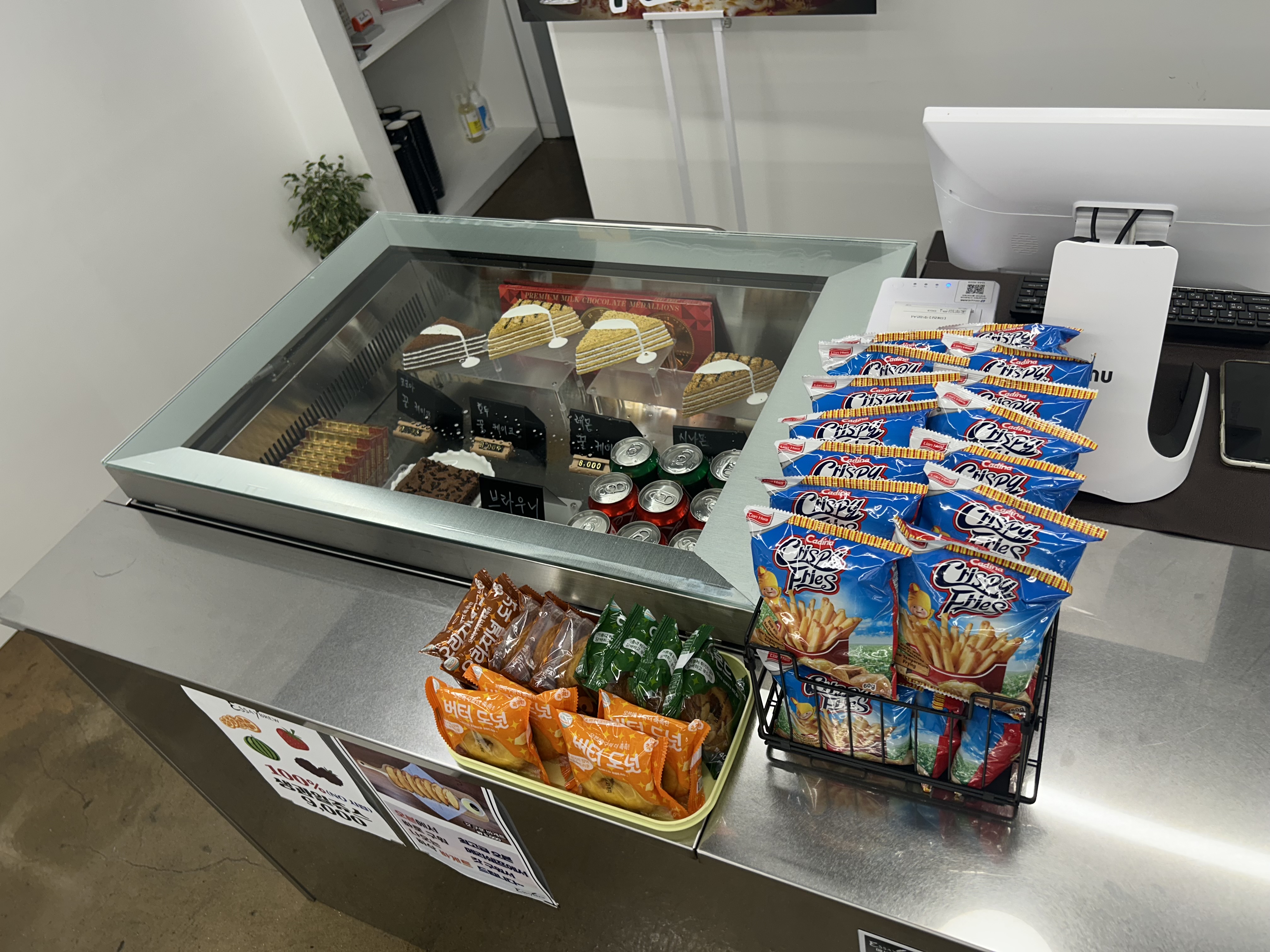 한편에는 주전부리랑 케이크도 구비되어 있네요.