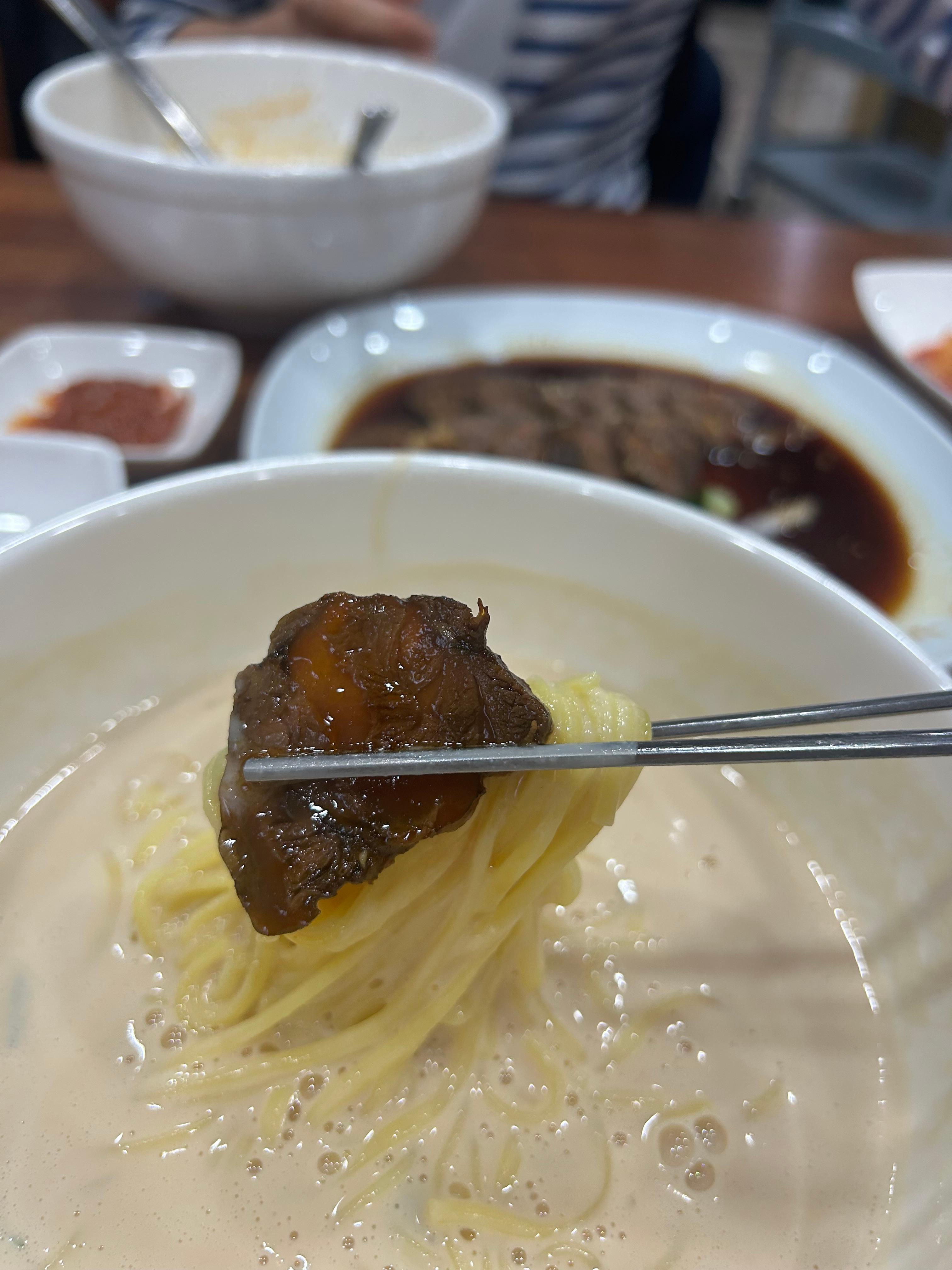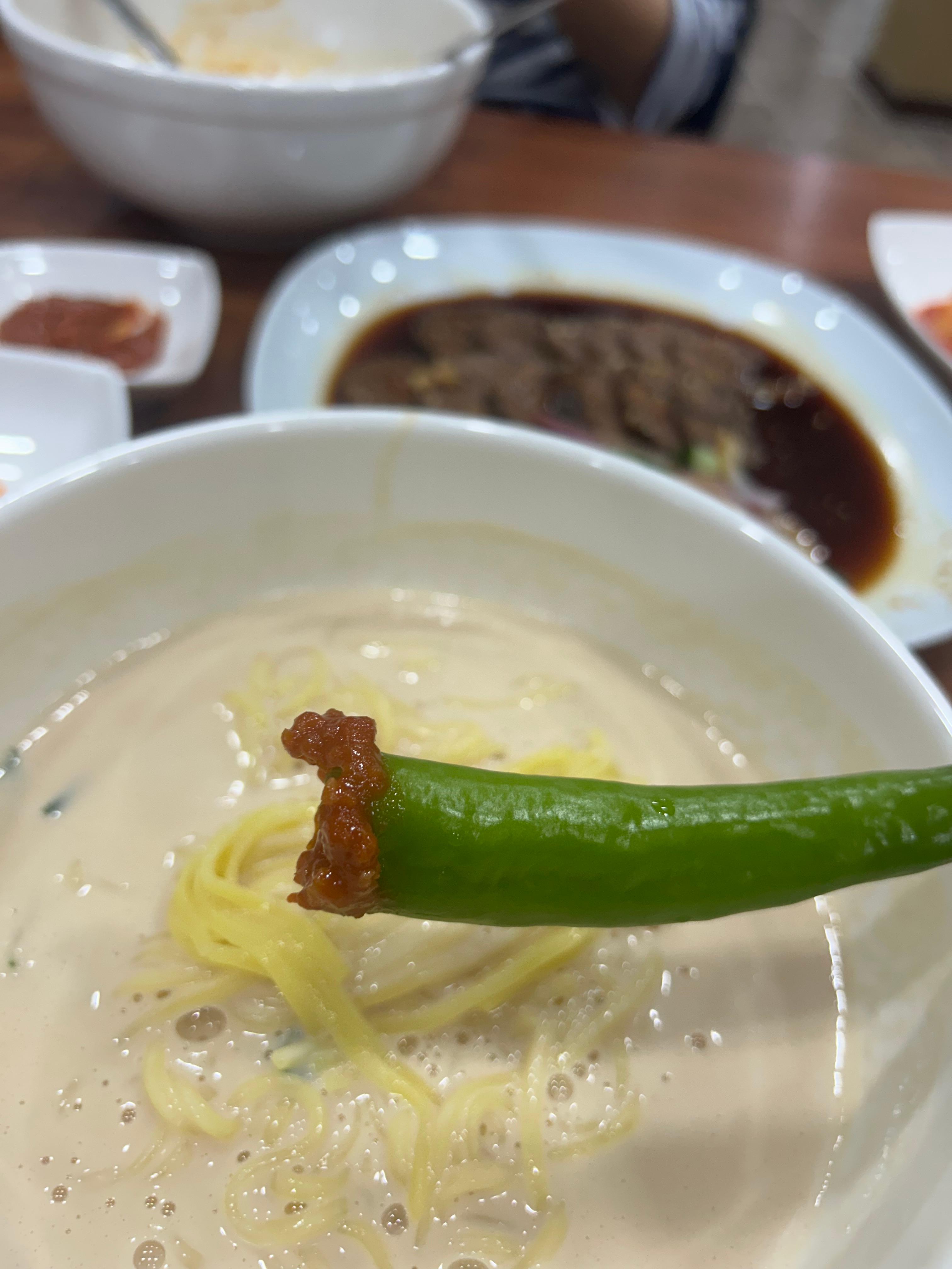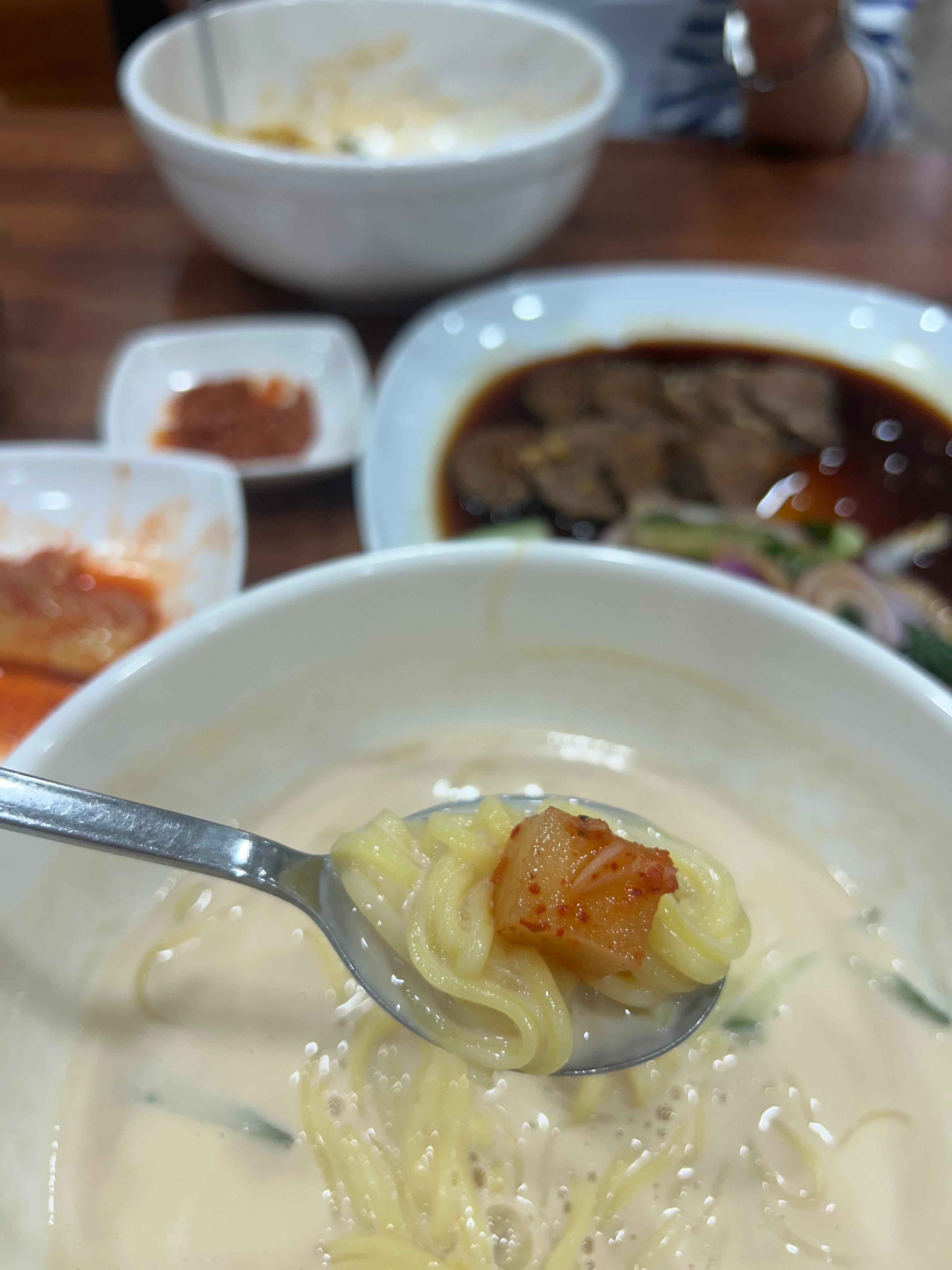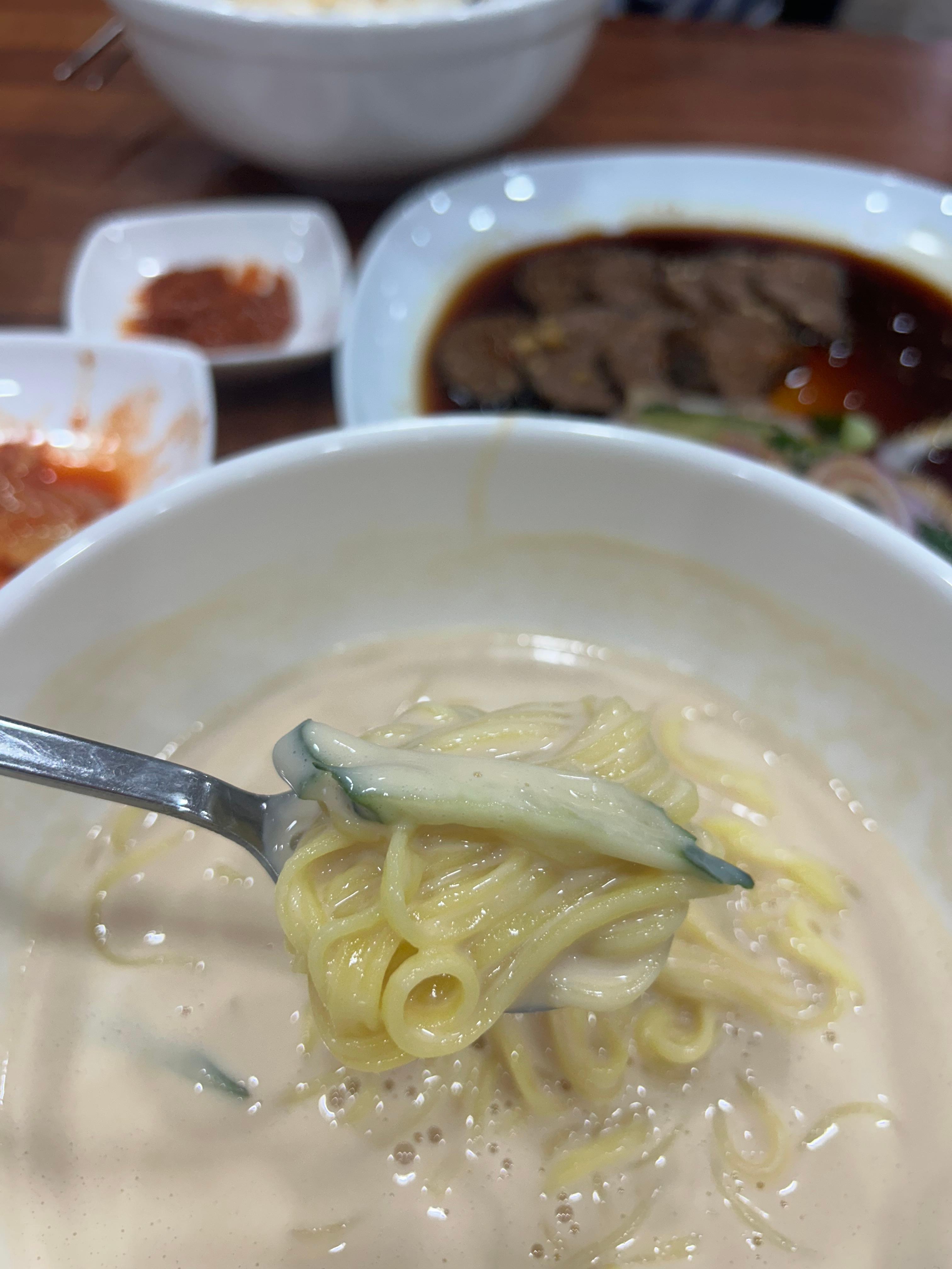 일단 찐~해 보이는 콩물속에 담긴 콩국수.
